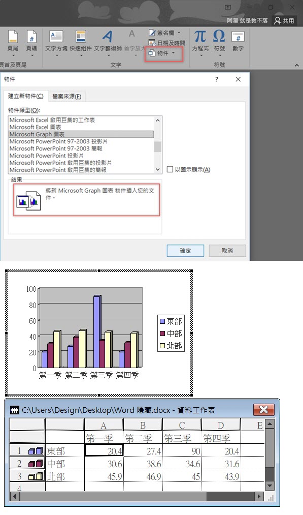 有兩種方式來插入圖表,第一種是從插入頁籤 → 圖表,另一種就是從插入 → 物件 → 建立新物件,並選擇 Microsoft Graph Chart,自動匯入內容後再行編輯,如果數據相當龐大,建議還是用 Excel 編輯吧。