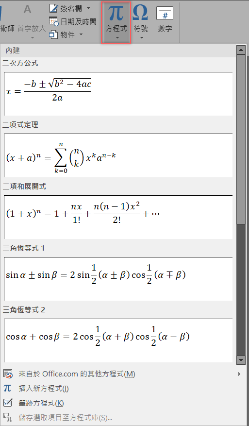 內建的方程式其實很強大,常見的各種公式、定理都能找得到,可以充分利用來設計自己的數學、物理或化學高級方程式,還支援筆跡可以用寫的來輸入,阿湯不禁想:沒這項功能以前的老師們,是怎麼出題目的呢?