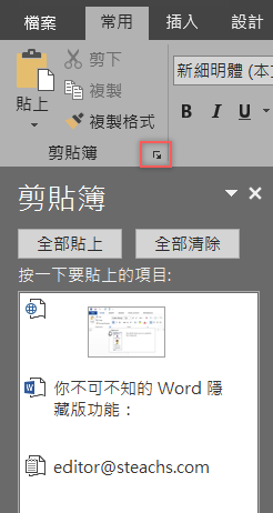 Word 內建的剪貼簿可以保留 24 個項目,將小箭頭點開後可以看到最近剪取的內容,包含文字及圖片等,並選擇個別或全部貼上、清除內容,也能移動視窗放在想要的位置。