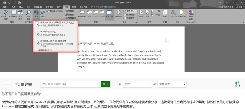 應該不少人習慣將要翻譯的文字手動複製,再貼到 Google 翻譯網頁上,其實微軟翻譯也不錯用,在校閱頁籤點開「翻譯」,選擇整篇線上翻譯、只翻選取文字或迷你翻譯工具,不確定的話可以跟 Google 比較看看結果。