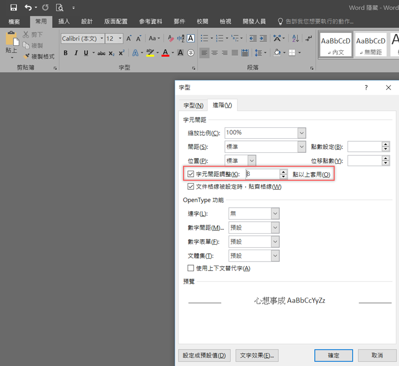 點開字型旁邊的小箭頭開啟設定,到進階區看到字元間距,再根據需求更改間距、位置及多少點以上套用,以獲得更好的視覺效果,當你在 Word 上設計大字體時,字距就變得相當重要,像是電子書封面、論文封面等。
