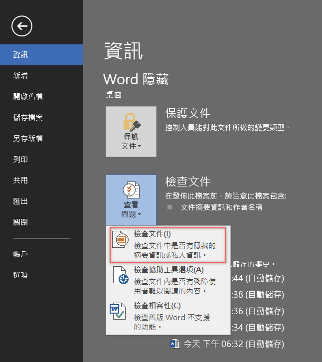 從檔案 → 資訊 → 檢查文件這項,點開查看問題 → 檢查文件。