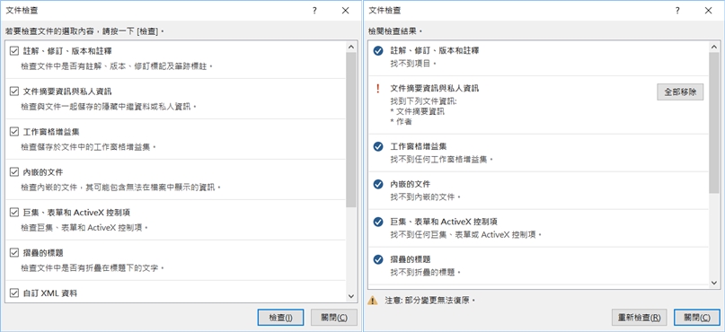 勾選要檢查的項目後按下檢查,結果出來顯示驚嘆號的項目就是有問題的部分,可以在這裡移除內容,或選擇回到文件去更改,通常會用在共用的文件,如果你擔心透漏的什麼隱私或安全相關的內容,就可以用這個方式。