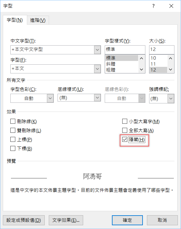 Word 的文字是可以隱藏的,選取要隱藏的部分後再點開字型設定,勾選「隱藏」,底下也能預覽確認一下內容,可以用在設計測驗,或只是想隱藏一些不想被看到的話。