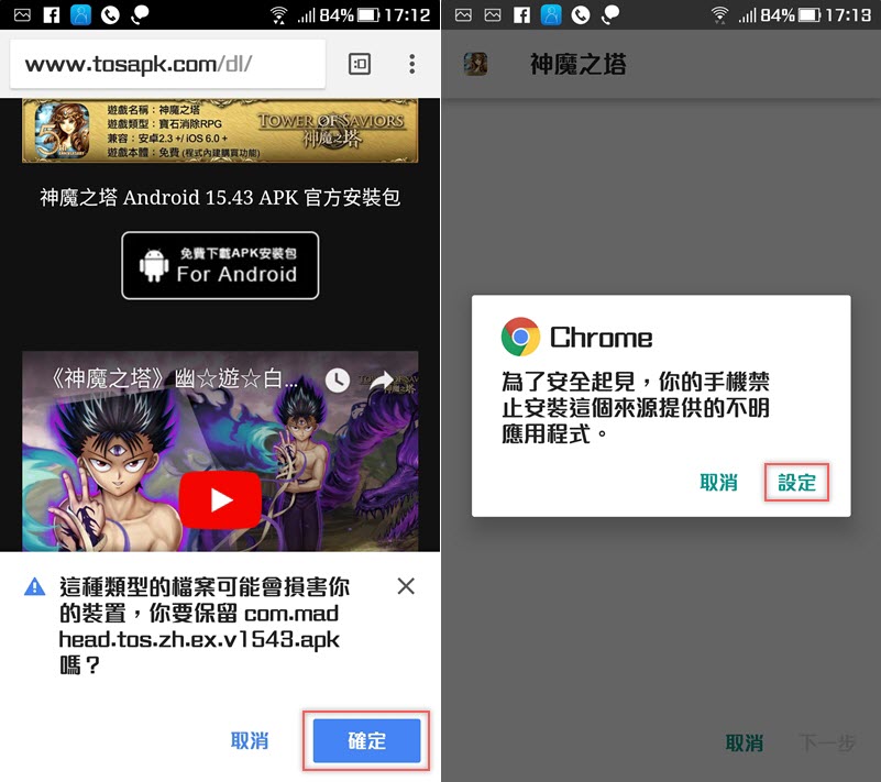 假設阿湯想要下載神魔之塔的 Apk,手機跳出提示之後,按確定,如果又跳出一次 Chrome 警告,就進入設定。