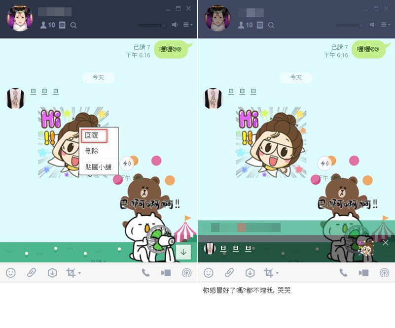 貼圖也是一樣的步驟,右鍵點回覆再輸入內容。