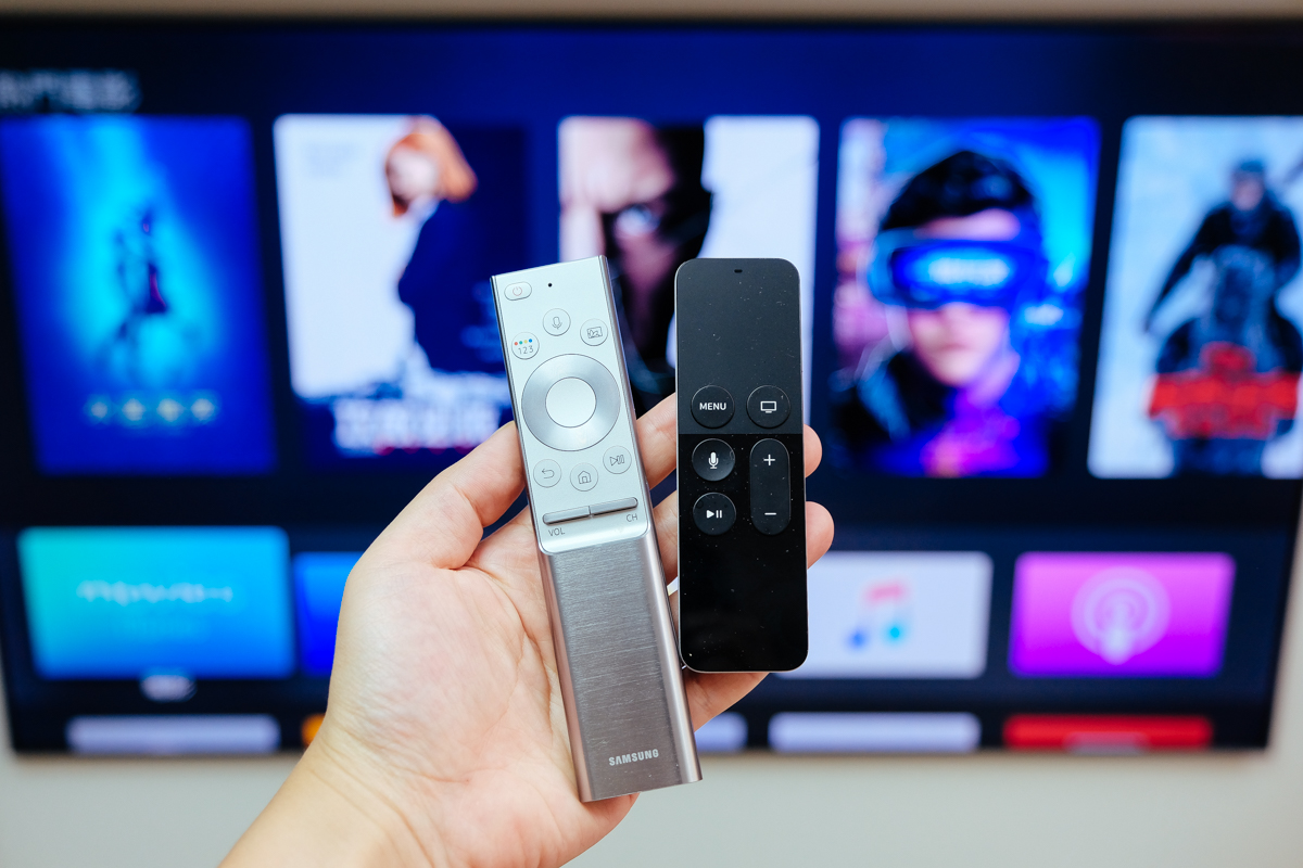 但在 Samsung Q9F 上的智慧型遙控器就相對便利很多,以 APPLE TV 來說,安裝後自動會出現在電視主選單裡,當你切換成 APPLE TV 設備時,遙控器此時就會自動轉為控制 APPLE TV,完全自動辨識,不需要額外設定或切換,所以我的 APPLE TV 這一個月來再也沒用到,為了拿出來拍一下,我還找了一下....
