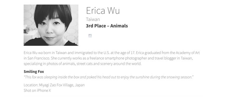 另一位獲獎的台灣人是曾經同樣在動物類中獲獎的 Erica Wu。此次作品是以 iPhone X 在日本藏王狐狸村中所拍攝的「微笑狐狸」,她並在照片中寫下這隻狐狸是在一個下雪天中正在將頭倚靠著小箱子睡覺時的畫面,也透過 Erica Wu 的鏡頭讓全世界的朋友都看見了狐狸可愛的睡覺萌樣!
