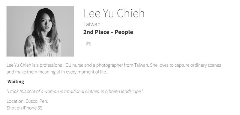 首先看到的是在人像類獲得第二名佳績的 Lee Yu Chieh,名為「Waiting」的作品是使用了 iPhone 6S 在秘魯的一片荒涼風景中拍下了一名身著傳統服飾的老婦人身影。