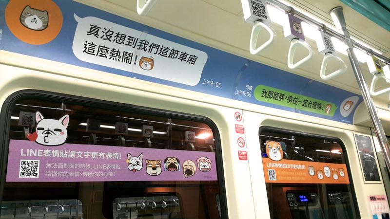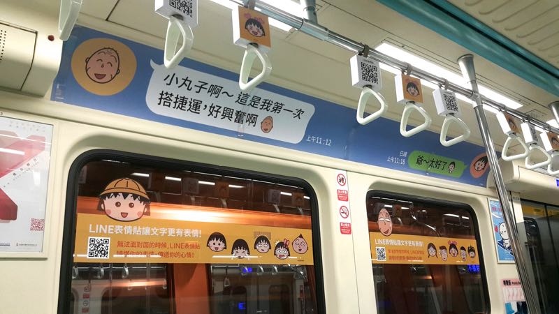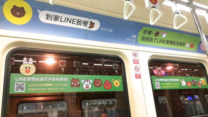 這次 LINE 和台北捷運局合作推出「LINE 表情貼慶祝列車」,會先在車廂第一節由 LINE 卡通明星領軍,看熊大、兔兔大放閃光,接著由台灣當紅創作為主題的車廂,來一一看白爛貓、貓貓蟲咖波、豆卡頻道、貓爪抓七嘴八舌嚼舌根,不時還有小丸子跟爺爺無厘頭的對話,讓不管是搭到哪一節車廂的朋友都能充滿歡樂和好心情。