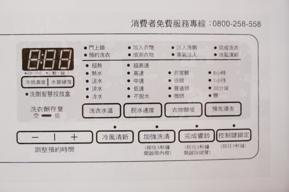如果各種洗衣行程還不夠滿足你的需求的話,在手動操作的部份還有非常多細項可以選擇,像是水溫控制(內建有水溫加熱器)、衣物髒度,還能設定水質硬度,以及非常好用的 FanFresh 冷風清新功能,這可以讓你在衣服洗好後持續的定時運轉洗衣槽,讓衣物不會因為你洗好後隔太久沒取出而悶住,最長可達 12 小時,所以你也可以睡前丟衣服下洗,睡醒再換丟乾衣機也問題。
