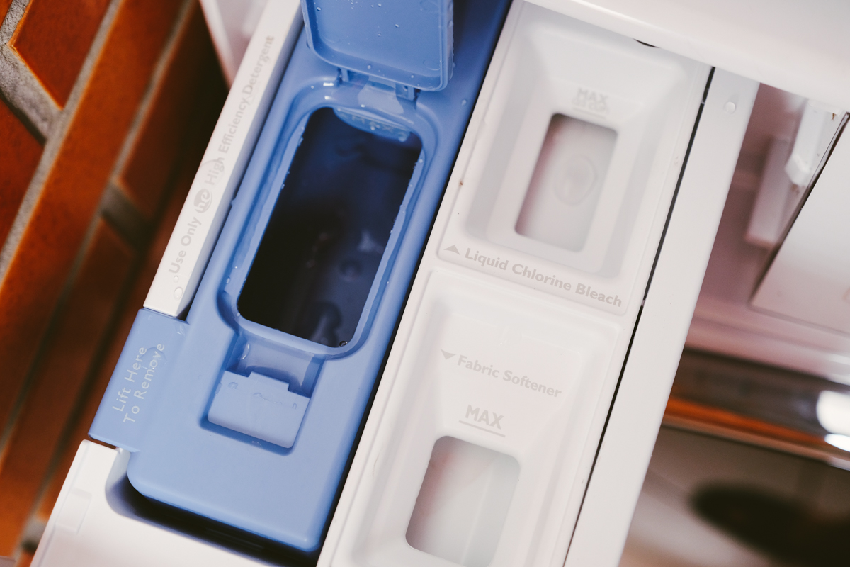 最特別的是左邊這個藍色的 Load & Go 洗劑智慧投放盒,最多可以一次倒入 550ml 的洗衣精,讓你不用每次洗衣服都要再加,裝滿一次最多可連續使用 36 次之多,會自動依照你選擇的洗衣行程跟重量來判定要投入多少劑量,完全不用自己手動操作。