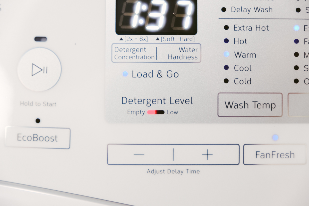 如果你有使用 Load & Go 洗劑智慧投放盒,在面板這裡也會顯示洗劑存量「Detergent Level」,就知道該再添加囉。