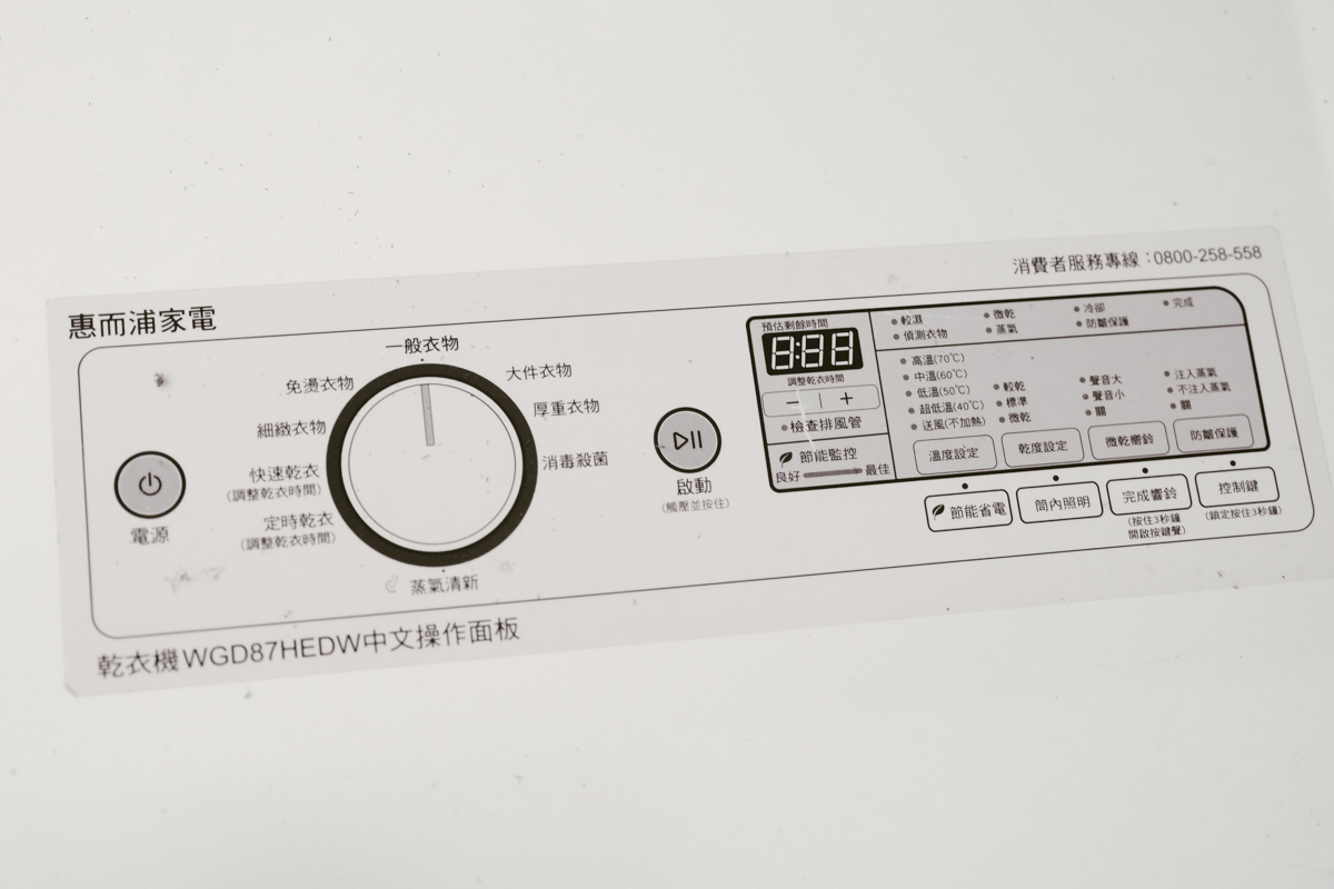 惠而浦洗衣機或乾衣機上的面板都是英文,這是因為美國原裝進口的關係,不過都有附中文使用手冊,以及一張操作介面的中文對照貼紙,像阿湯就把洗衣機的中文介面貼紙弄在乾衣機上,方便查看。