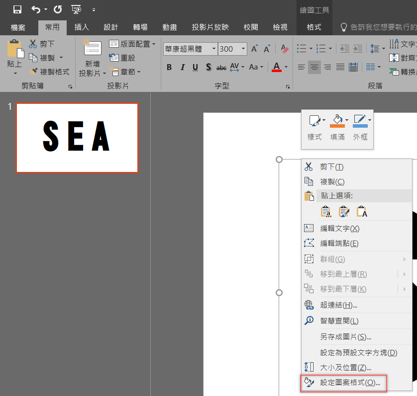 點文字框按右鍵 → 設定圖案格式。
