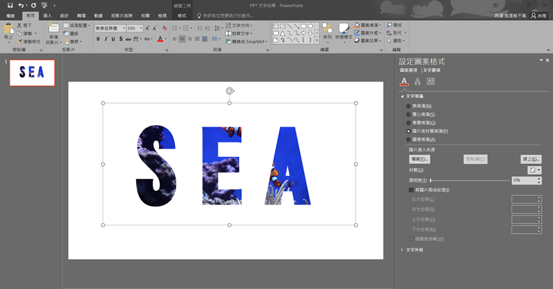 切換到文字選項,點選「圖片或材質填滿」後插入檔案。