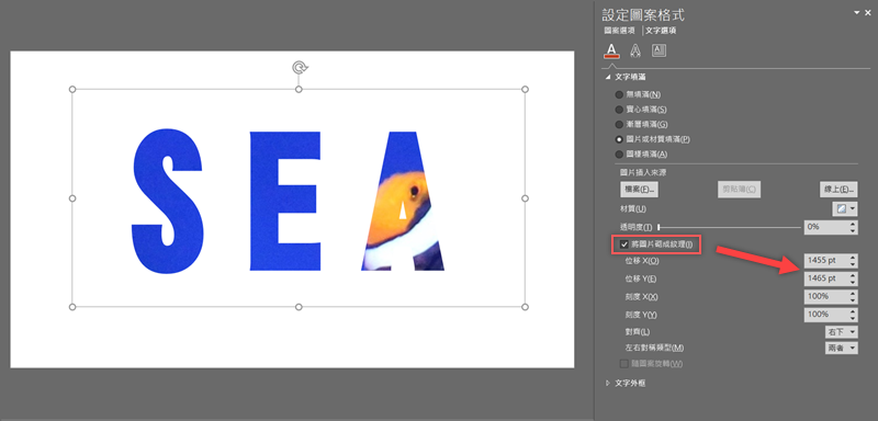 第二種方式,阿湯改了一張底圖再以同樣的步驟嵌入,勾選「將圖片砌成紋理」,就可以藉由 X 軸與 Y 軸的位移,來調整字體中要顯示哪些部分的底圖。