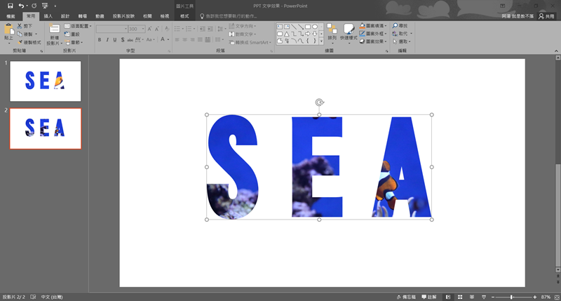 第三種方式,插入圖片並放到文字底下,這時候就可以任意移動圖片,字體遮蓋的部分就是會顯示的部分,按住 Shift 同時選取文字與圖片。