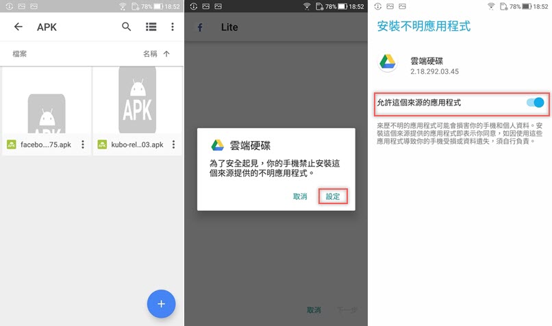 再來是使用雲端硬碟並以 Google 來示範,建議先將要下載的 APK 檔另開一個資料夾儲存,如果你在上一步並沒有選擇開啟所有程式的權限,一定還會再出現一次提醒,只要按下設定後更改即可。