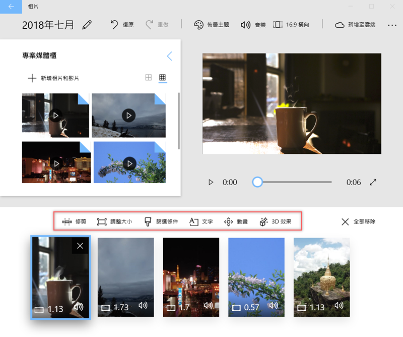 專案媒體櫃裡就是所有的檔案,可以再次新增內容,如果只是單純要合併影片就直接輸出檔案什麼都不加,也能在這裡先做修剪、調整大小、篩選條件、文字、動畫、3D 效果。