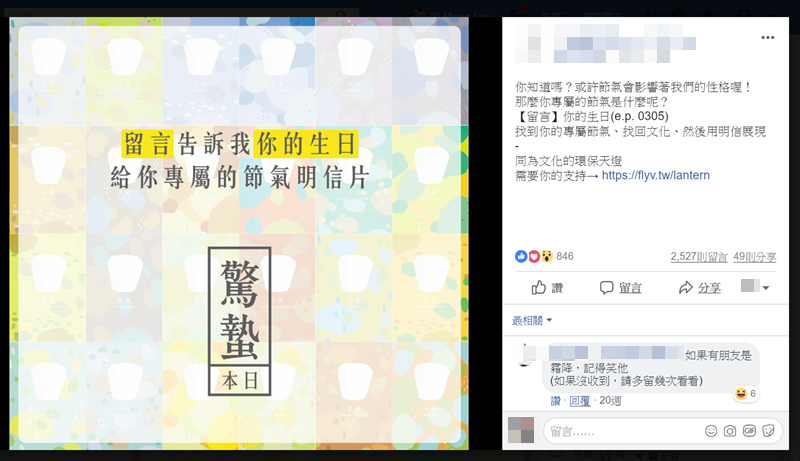或是客製化商品,像這篇是以私訊的方式,先提供生日,再依序互動,不過雖然說對方可能只是做參考不會拿你的生日去幹嘛,但網路上是沒有秘密的,大家也可以進入粉專去了解一下,是不是有在經營還是洗文章。