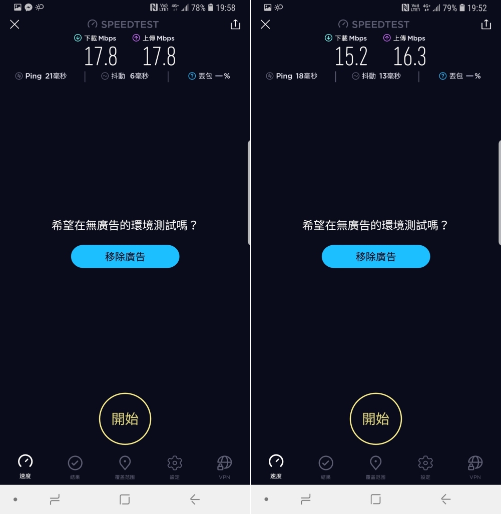 下面這二個測速點則是在台中公園中央的湖區,分別是中央跟湖邊,在下載的部份為 15~17Mbps,上傳則是仍然維持有 15Mbps 以上的水平。