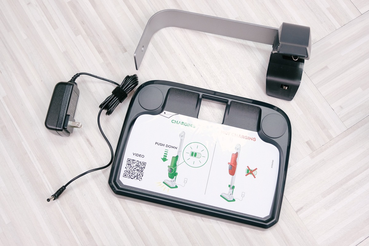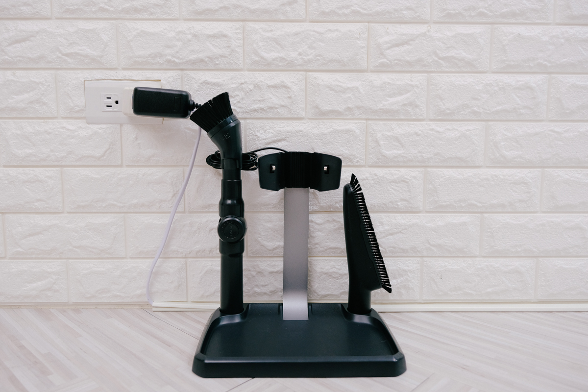 在充電底座的二側也有吸頭收納孔,可以將額外的二個吸頭及轉角延伸管一併放置在這裡,省去收納一堆吸頭的問題,因為光這幾個放在這裡,其實等於是收了五個配件,毛刷吸頭、轉角延伸管以及三合一吸頭(算三個)。
