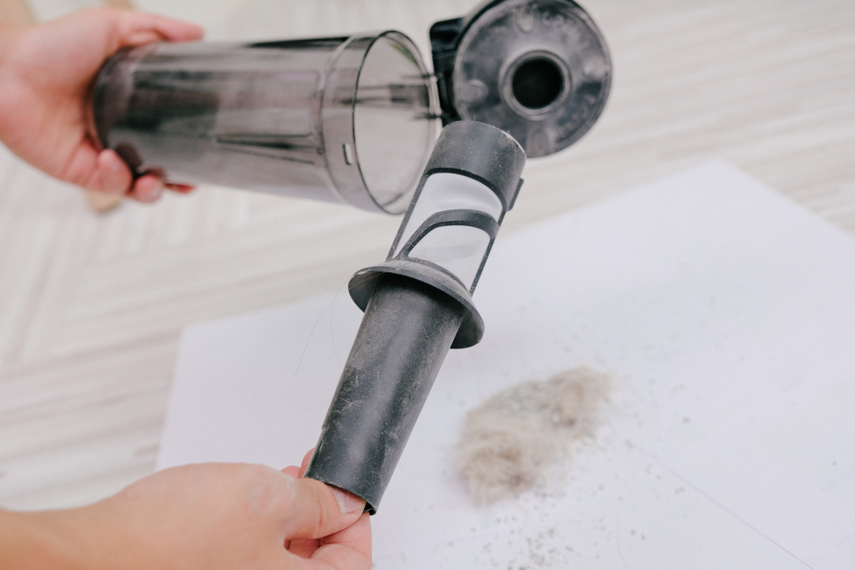 在打掃完家裡千百回後,當然就到清理集塵盒的時候啦,取出集塵盒的方式阿湯同樣認為也設計的很符合人體工學,大多無線吸塵器的集塵盒都是和機體合在一起,無法單獨取出,因此每次要倒垃圾時就顯的稍微笨重,而伊萊克斯這款 PURE F9 無線吸塵器則是只要按壓一下就可以輕鬆取出集塵盒。