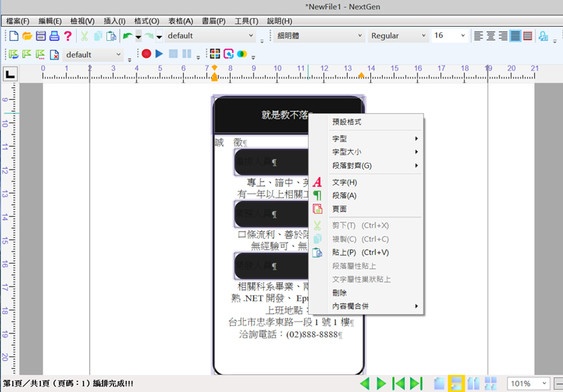 阿湯使用一篇分類廣告當範例,更改文字、顏色或是移動色塊都蠻好操作的,有用過類似軟體的人應該會覺得很簡單,而且是中文介面。