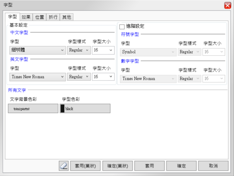 各種字型的基本設定、效果、位置、折行等都能隨意調整後套用。