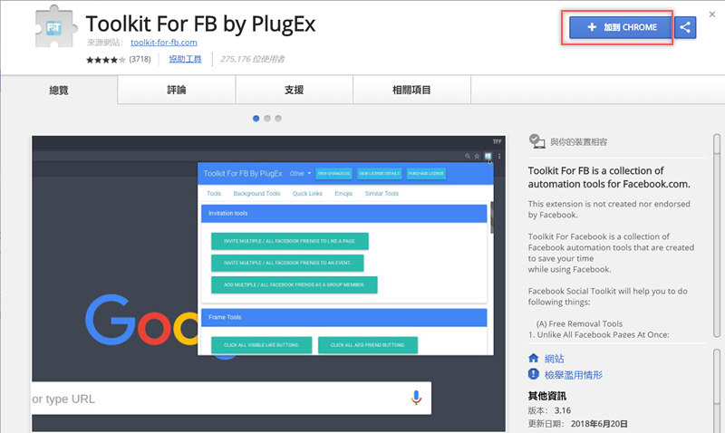 這套工具全名是 Toolkit For FB by PlugEx,表示不是臉書官方的工具,加到 CHROME 後,需要同意臉書相關資料的授權,才能協助運作。