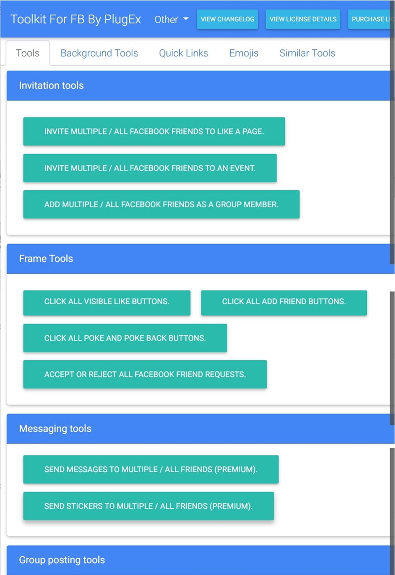 開始來用吧,功能真的非常多,有小編必備的邀請工具、群組工具,可以選擇部分或全部好友按讚、參加活動,帳號整理必備的取消關注粉專、好友,備份需要的提取電話號碼、下載影片、好友名單等等。