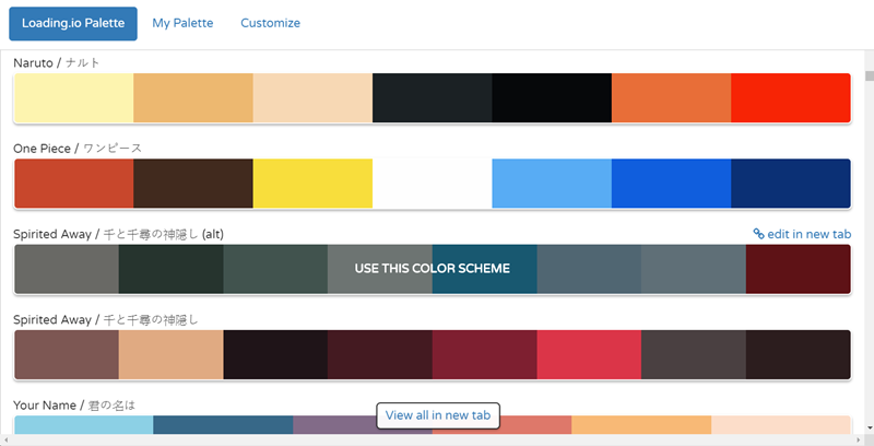 內建上百種包含基礎、各大品牌、網站、電影或遊戲等主題,像幾部日本的知名動畫也有標準配色表。