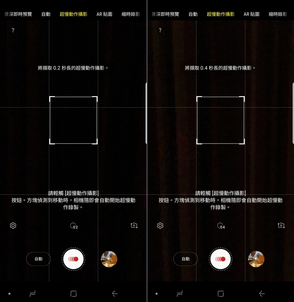 先來看一下超慢動作攝影,在 Galaxy S9+ 上時僅能拍攝 0.2 秒的慢動作影片,而在 Galaxy Note9 上則多了一個 0.4 秒的切換鍵,讓你選擇要擷取多長的慢動作影片,而目前各家旗艦機型的智慧型手機雖然有不少都搭載了 960fps 的慢動作攝影功能,不過目前功能及機制做的最好的非三星莫屬,光這個「陷阱」偵測框就完勝。