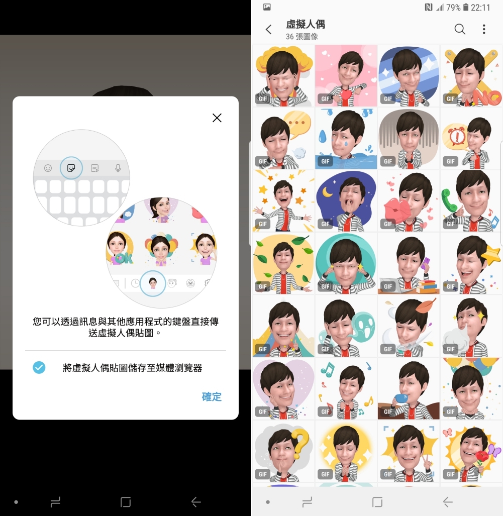 最後同樣會產生 36 張專屬你的虛擬人偶表情動態貼圖可以使用,用在即時通訊軟體上傳給朋友相當有趣。