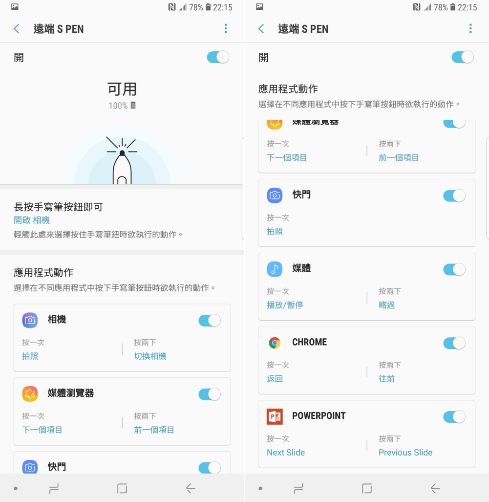 像是設定長按手寫筆按鈕的作用(預設為開啟相機),另外也可以針對部份應用程式設定按一下及按二下的作用,其中除了相機應用之外,用在瀏覽網頁及簡報使用上都是相當實用的功能。