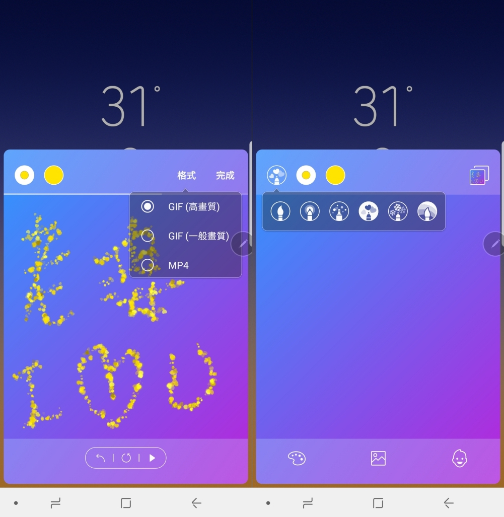 首先是手寫動態貼圖,情人節剛過,如果已經有在用 Note8 的朋友,應該很多人都用這功能手寫給你的另一伴了吧,產生的 GIF 動態圖或影片可以重複你手寫的筆跡,可以讓收到訊息的人更加感受到你的心意。