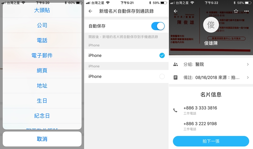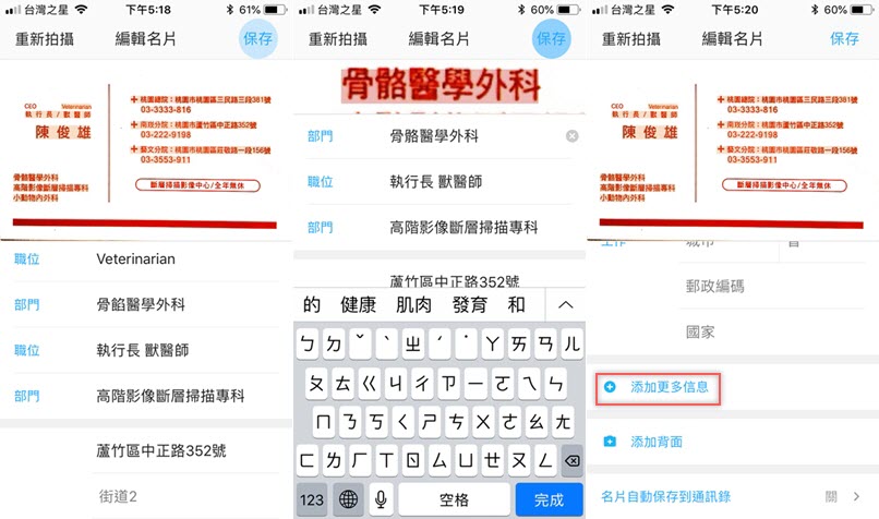 用拍照來新增名片,對準後馬上自動拍攝,速度快到阿湯來不及截圖,便自動辨識內容,基本中英文和數字都沒問題,雖然筆畫較多的字容易讀錯,但點進去修改就好,還能添加背面或其他信息。