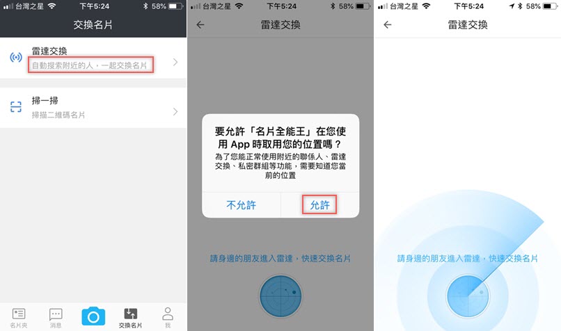 雷達交換功能適用於下載同樣 APP 的用戶,允許取用位置後會幫你掃描身邊的朋友來快速交換名片。