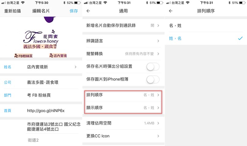 或進入個人設定調整,排列順序和顯示順序也能從預設的「名,姓」更改成中文慣用的「姓,名」。