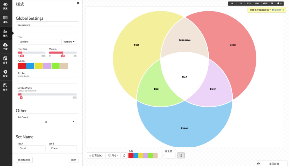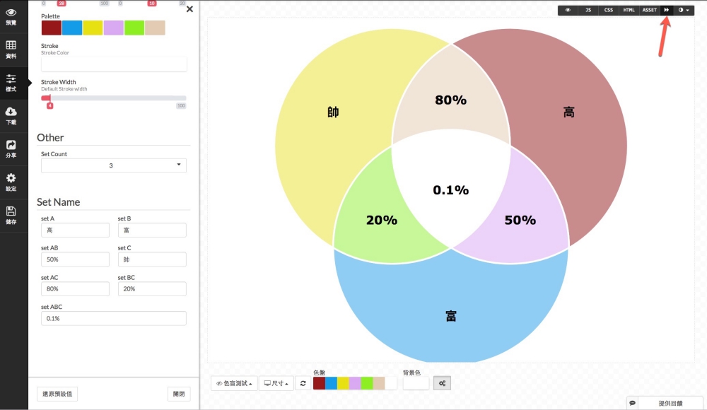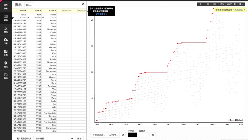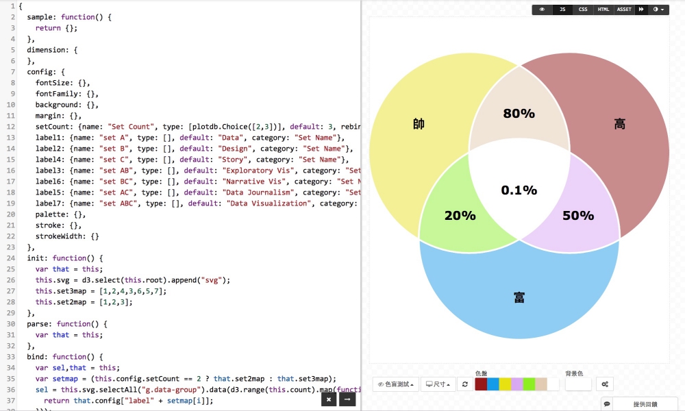 透過 PlotDB 這網站,只要選擇該圖表後,左邊就有樣式、顏色、文字等可以設定。