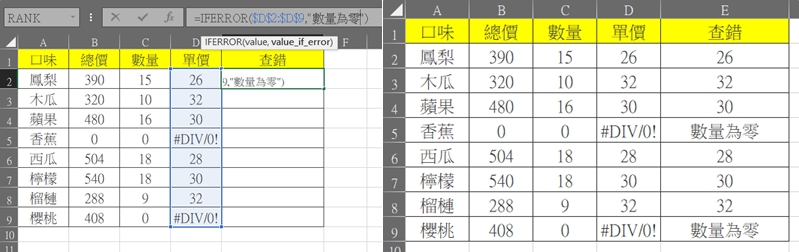 表示如果 D2:D9(單價)是正確的值就顯示出來,否則就顯示「數量為零」,往下複製就完成除錯。