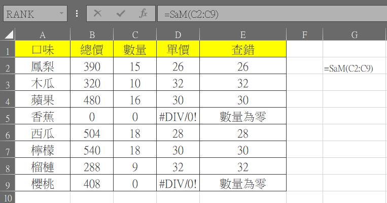 打錯的那格按 Enter 後就會變成「#NAME?」,一樣輸入除錯公式: