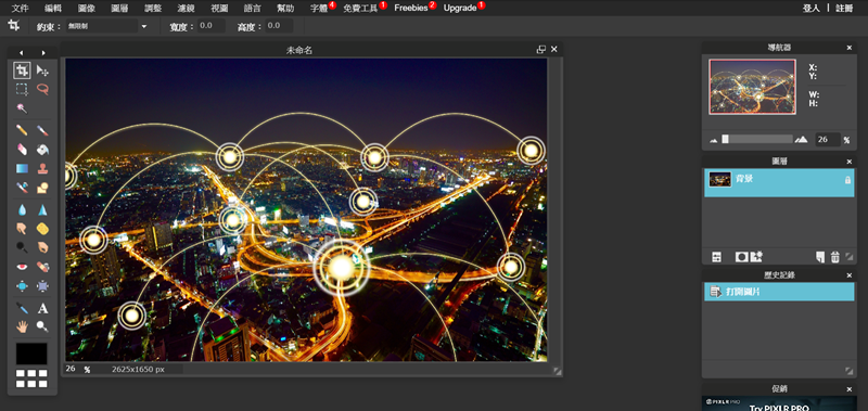 選擇用 PIXLR 就會開啟這個分頁,可以加上文字、圖樣等各種調整,最後再下載,圖層和歷史紀錄功能都有,蠻方便的。