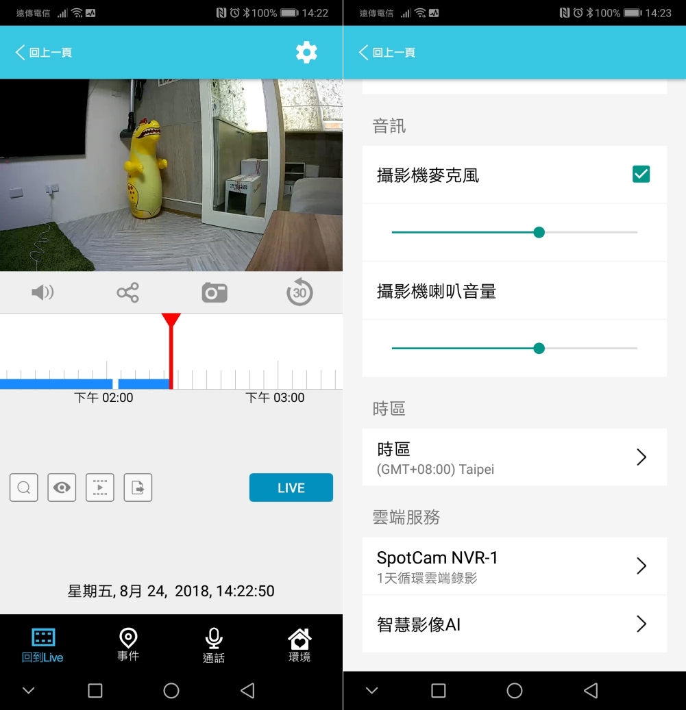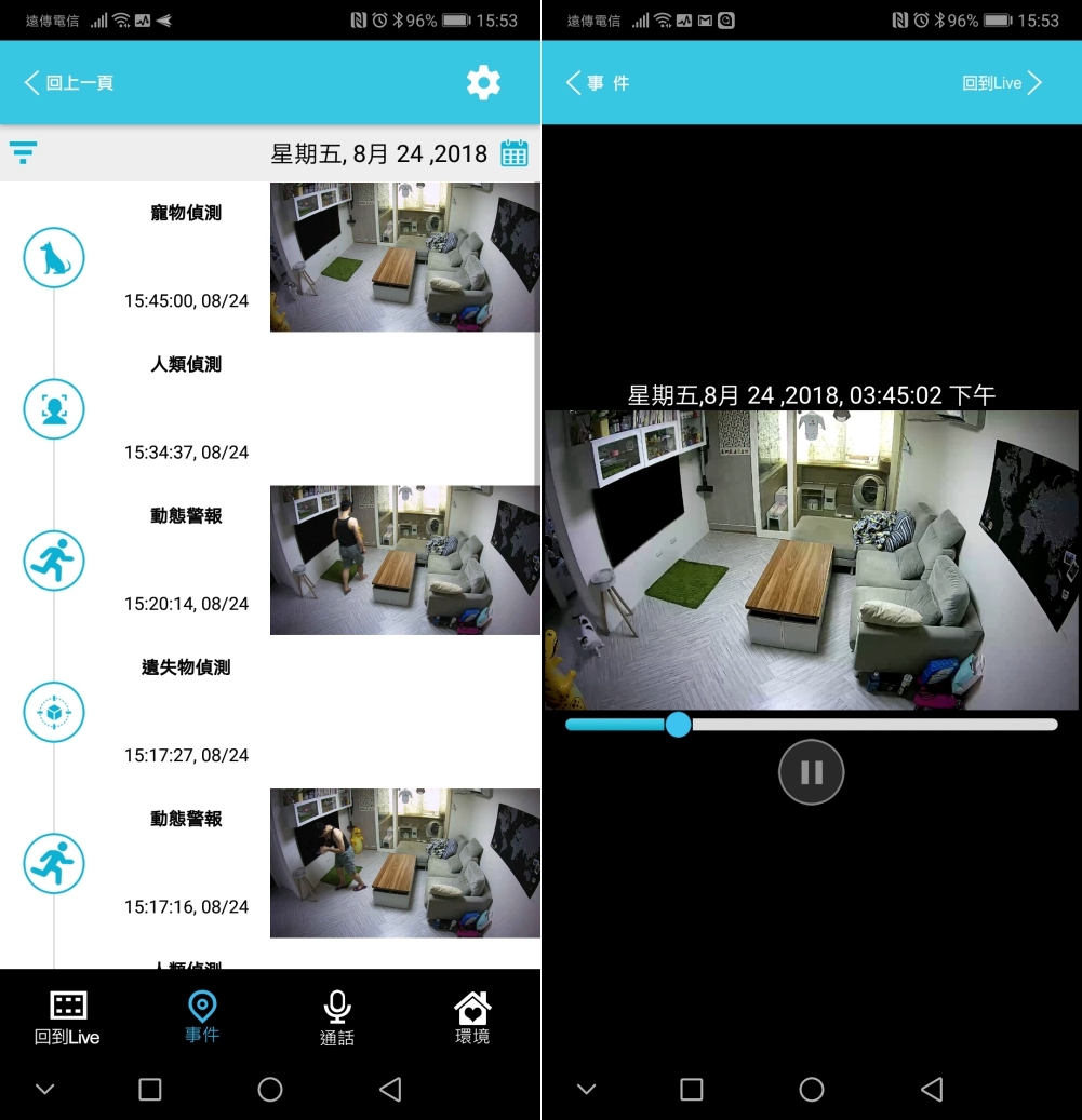 不論是哪一項設定,當觸發條件後都會在手機上跳出通知,並且可以在事件區裡看到觸發了哪一個項目,點擊後就可以馬上查看該事件的錄影回放,就可以立刻知道當下的影像狀況囉。