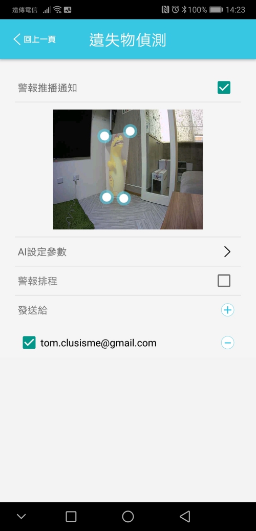 首先是遺失物偵測,這種很適合用在展覽物品、或店家來使用,可針對要監控的物品進行設定範圍,當物品只要被移走就會發出警報通知你。