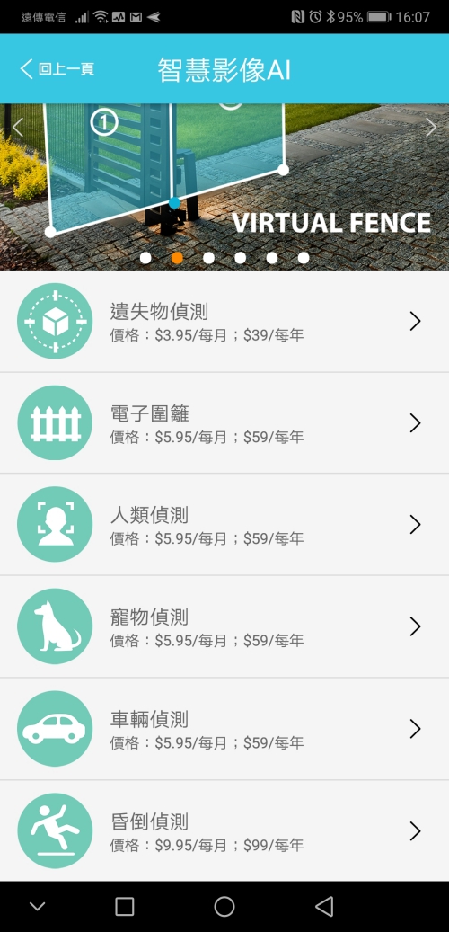 而上面提到的智慧影像 AI,你只要訂閱需求的服務就可以了,所有的偵測項目都是分開計費的,從 39 美金~99 美金不等,每項偵測服務換算下來一年最貴也就 3 千台幣不到,一般這種專門的影像監控系統都是用於企業為主,專門的攝影機一支可能就要價服務費幾百塊美金,SpotCam 相較之下真的是 CP 值很高,而且只要針對想要用到的功能開啟服務就好,不用被強迫功能要全買,而且還有每月訂閱的方式,如果你只是短期的需求,也只要開通一個月就好,相較之下在使用來說也更有彈性。