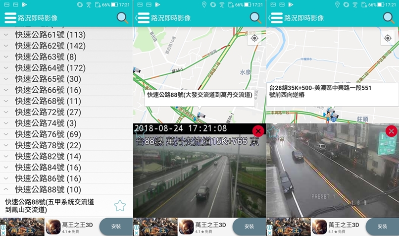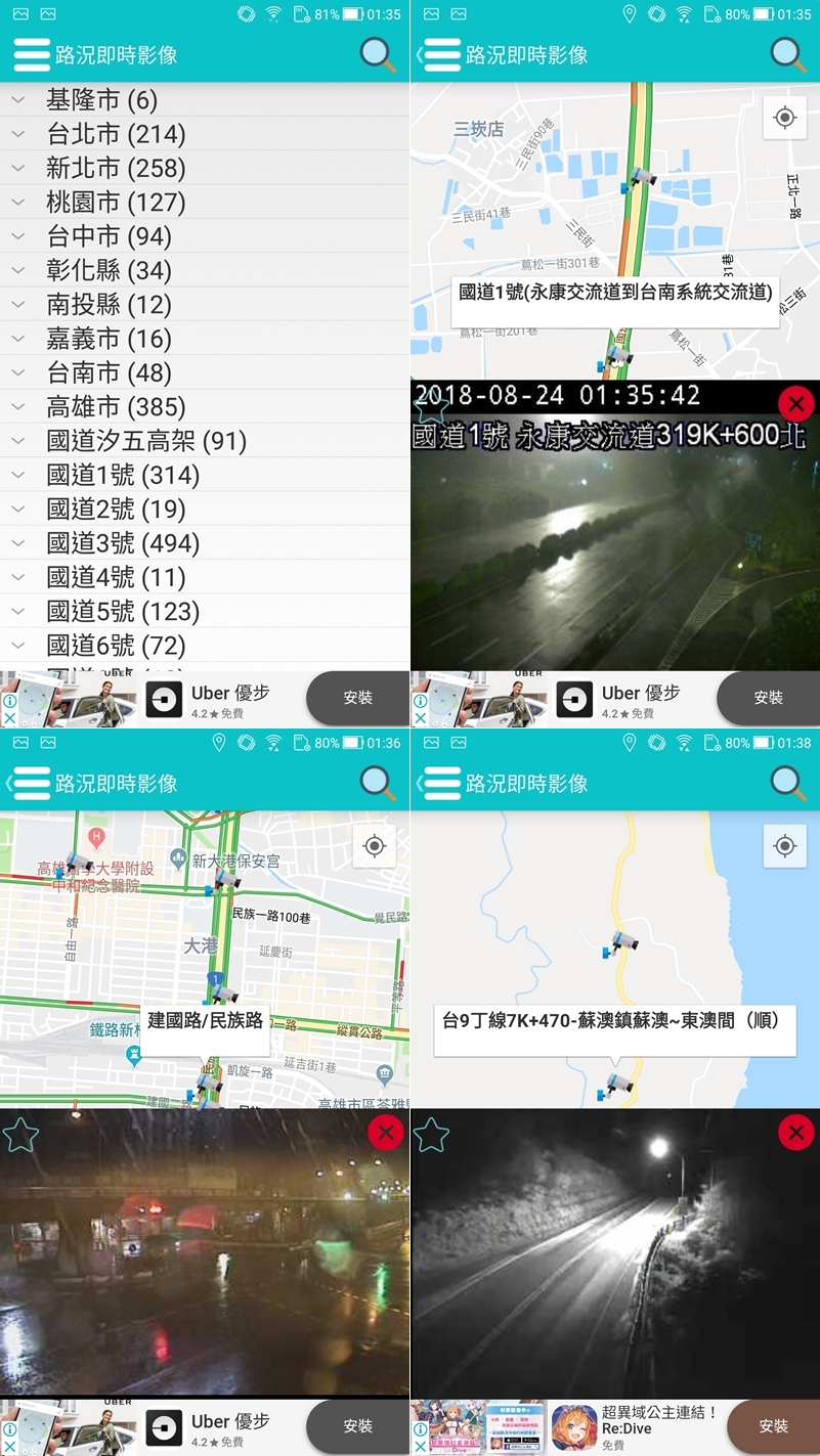 切換到清單模式看一下其他地區的狀況,除了依縣市分類也有依道路性質來分,阿湯就分別查看國道、平面道路和縣道,南部地區路面還是濕的,高雄那張看得出雨還蠻大的,偏僻的山路也能查看。