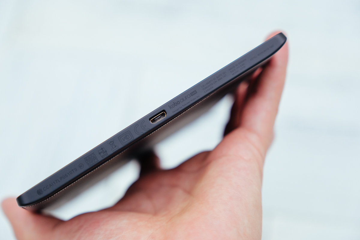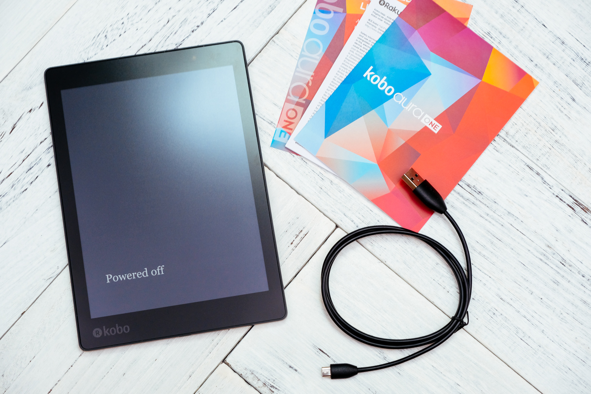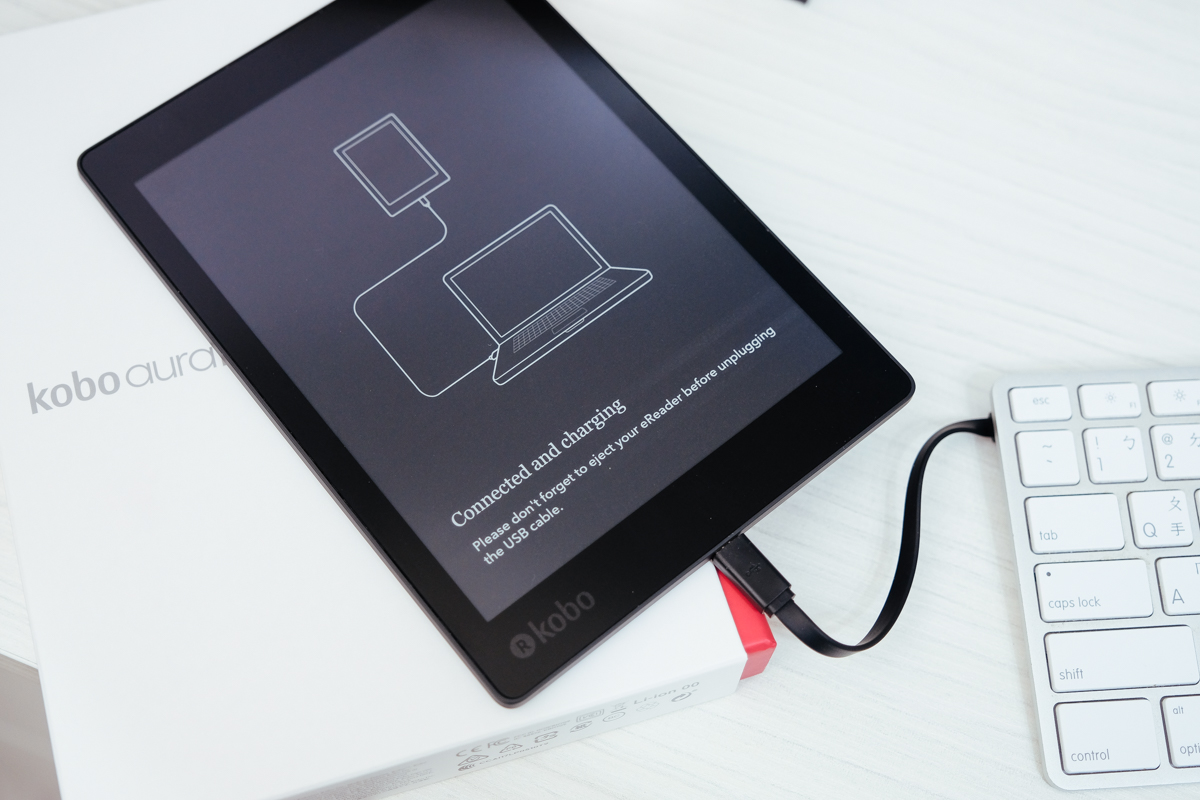 包裝內含簡易的使用手冊(非中文),Kobo aura ONE 電子書閱讀器以及 microUSB 的連接線(也做為充電使用)。