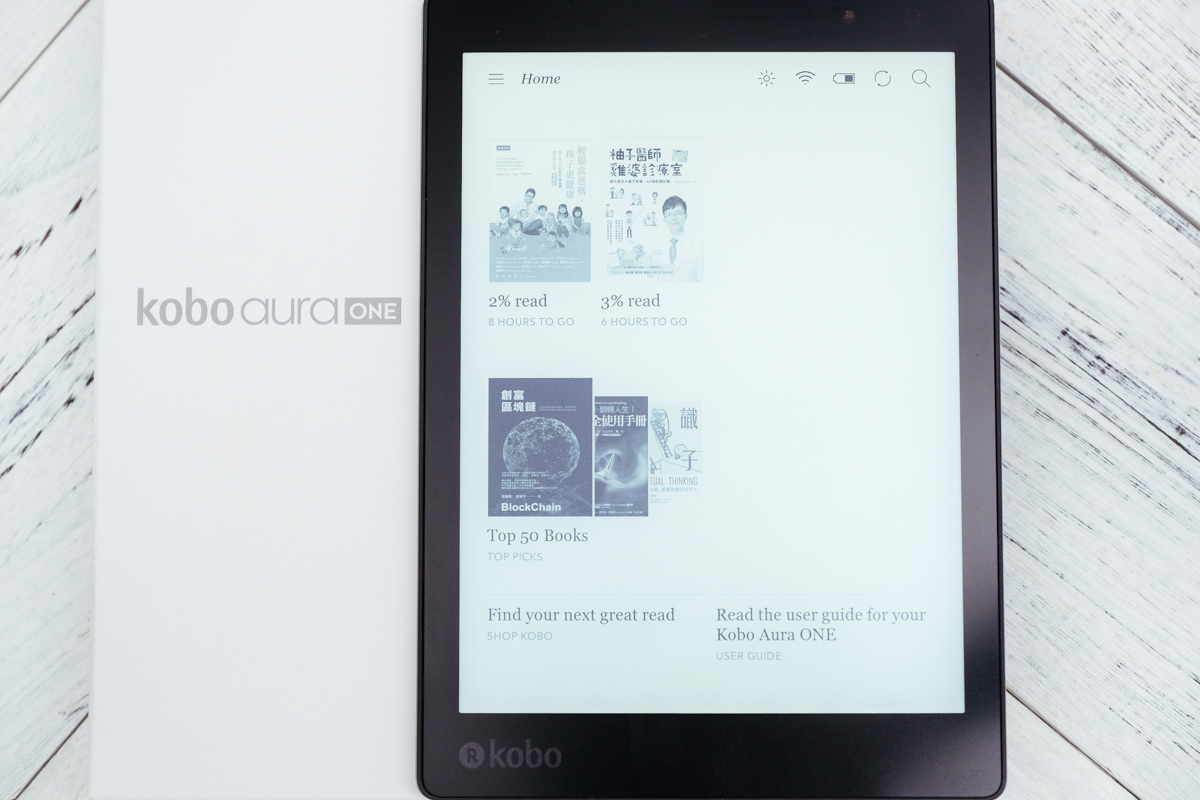 Kobo aura ONE 電子書閱讀器的首頁預設會是顯示你近期讀過的書以及目前 Top 50 的書籍。